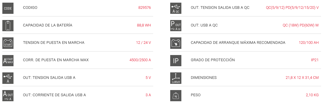 - Arrancador de emergencia 12V/24V para una amplia gama de vehículos, desde vehículos ligeros a vehículos comerciales;