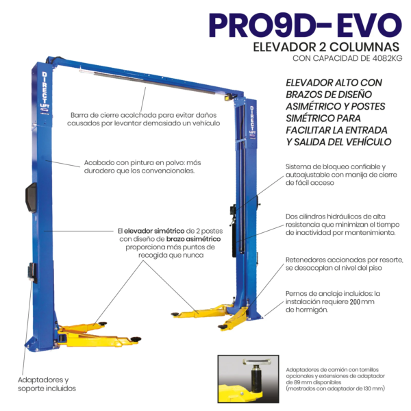 El Direct Lift Pro 9D es un elevador automotriz de 2 postes asimétricos con capacidad de 4,082 kg. El Pro 9D es uno de los elevadores más populares que ofrecemos. Incluye un juego gratuito de adaptadores para camionetas y todo el hardware de montaje.