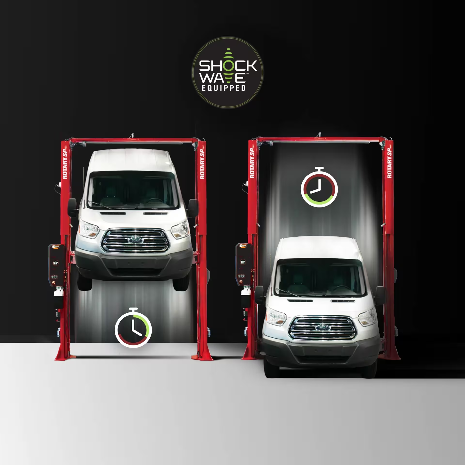 Opción Shockwave™ Accelerator Los elevadores equipados con Shockwave™ son los más rápidos del mundo. Proporcionan un ascenso y descenso dos veces más rápido, aumentando la velocidad, productividad y rentabilidad de tu taller.