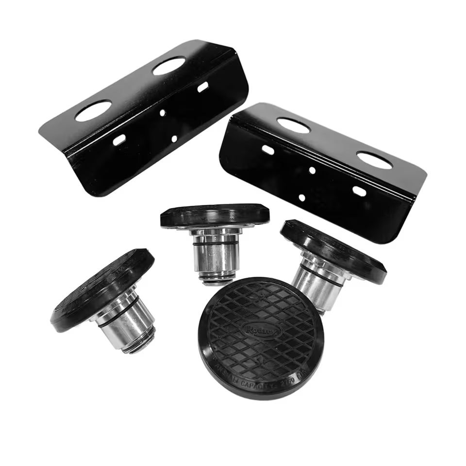 Brazos óptimos de tres etapas Los brazos delanteros y traseros de tres etapas de Rotary Lift proporcionan un alcance y retracción líderes en la industria para acomodar una amplia gama de vehículos, desde autos pequeños y de perfil bajo hasta camiones pesados. El kit incluye adaptadores para camiones y apilables que enganchan con precisión los puntos de apoyo de vehículos monocasco y chasis de camión. Los adaptadores de goma redondos son opcionales para autos de perfil bajo.