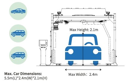 Dimensiones máximas del coche: 5,5 m (largo) x 2,4 m (ancho) x 2,1 m (alto)