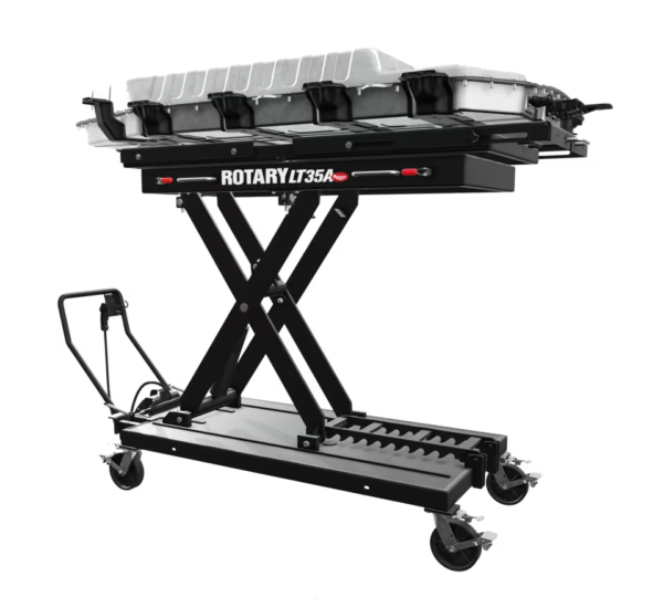 Con una base ultra ancha, la mesa elevadora LT35A de Rotary (patente en trámite) ofrece una estabilidad y ajustabilidad incomparables para talleres que manejan hasta 3.500 lbs. Con un control colgante fácil de usar, esta mesa elevadora neumático-hidráulica de alta resistencia ampliará tus capacidades de servicio y transformará la forma en que trabajas con componentes pesados de vehículos, como baterías de autos eléctricos.